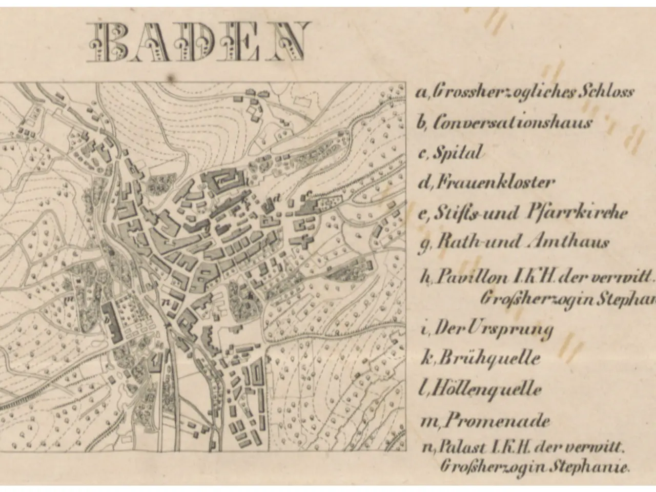 The image shows an old map of the city of Baden, Germany, with text written on it. The map is...
